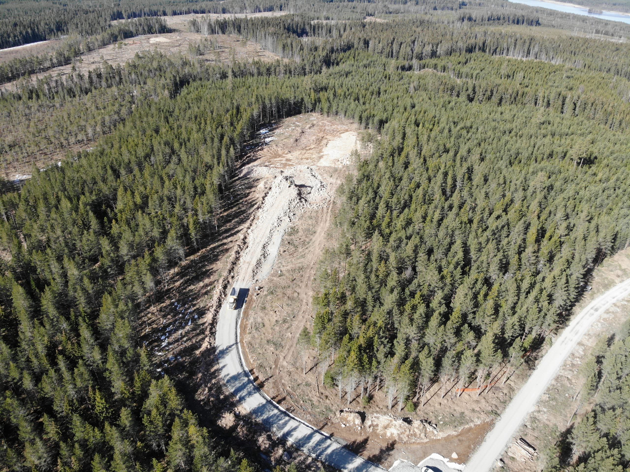 I en serie här på hemsidan kommer vi följa ett verk från projektering tills att det sätts i drift. Nu börjar alla delytor ta form som behövs för att vindkraftverket ska kunna resas. Längst upp i bild ser ni kranytan och till höger om den kommer vindkraftverket byggas. De första torndelarna sätts med en mindre kran och sedan kommer den stora kranen som lyfter de översta delarna av vindkraftverkets torn, tornhuset och vingarna. Stora kranen står på kranytan och för att resa den, som har en bom på över 140 meter, behövs mindre kranar som ställs utefter vägen. De mindre kranarna lyfter delar av kranens arm så att dessa kan monteras ihop. Intill kranytan syns ett trädfritt område med två uppstickande ”kullar”, här ska vingarna ligga när de förbereds inför lyft. Korsningen längst ner i bild används också som vändplats för de tomma lastfordonen och behöver därför klara att man svänger åt båda hållen.